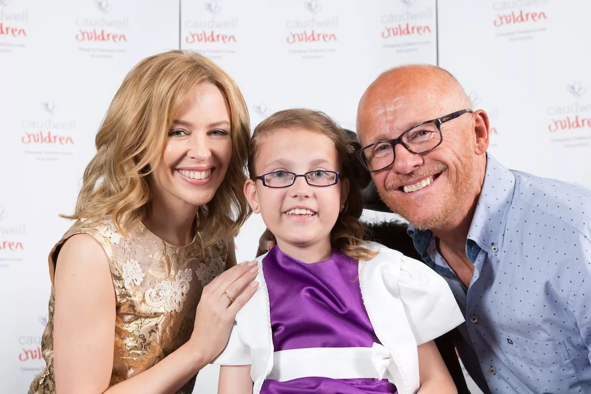 Singing legend Kylie Minogue with John Caudwell and a child benefitting from the work of Caudwell Children