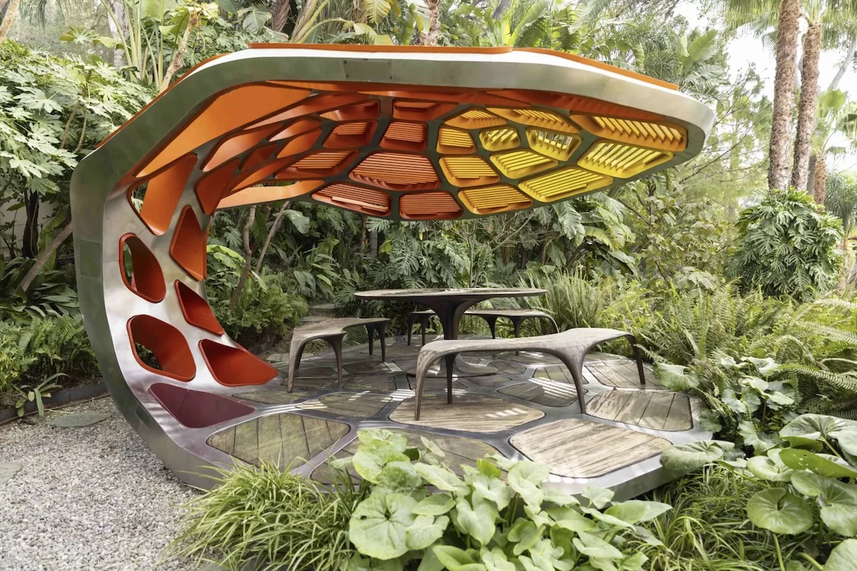 A sculptural dining pavilion designed by Zaha Hadid in collaboration with Patrick Schumacher — one of a strictly limited number ever produced — will be offered at auction in Monaco on Wednesday 8th April, with an estimate of between €900,000 and €1.1 million.