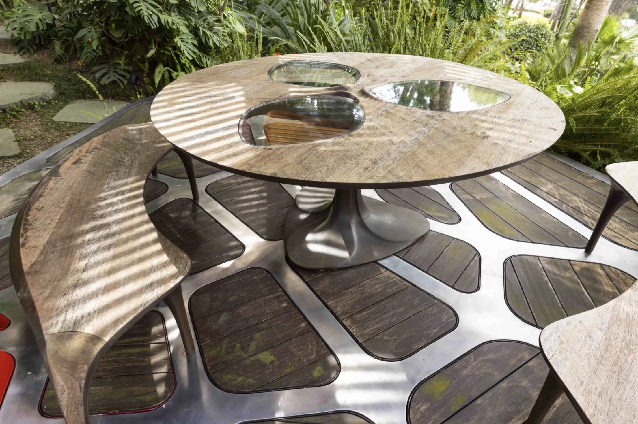 The lot includes a matching table and benches, extending the formal language of the pavilion into functional furniture.