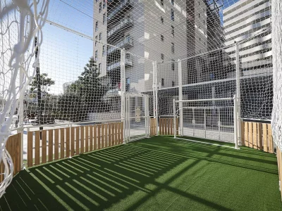 A fenced court for football and ball games provides a dedicated space for young residents in Monaco's residential quarter.