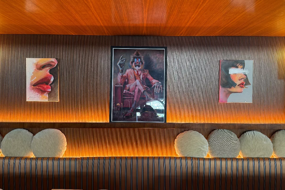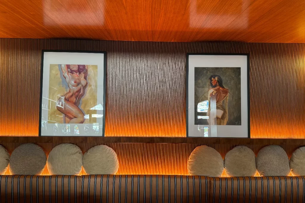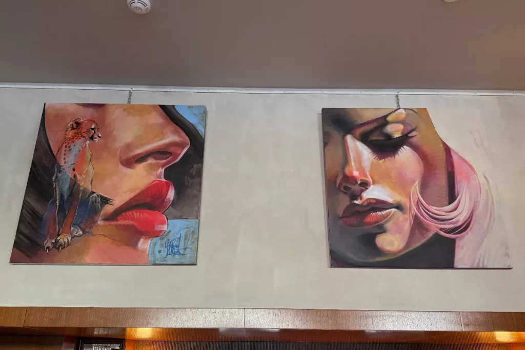 This connection between women and felines runs throughout the collection. James paints his subjects with what he describes as a leonine quality: strong, nurturing and sensual. In a visual trick, he even incorporates subtle female silhouettes within the features of the big cats that appear in some works.
