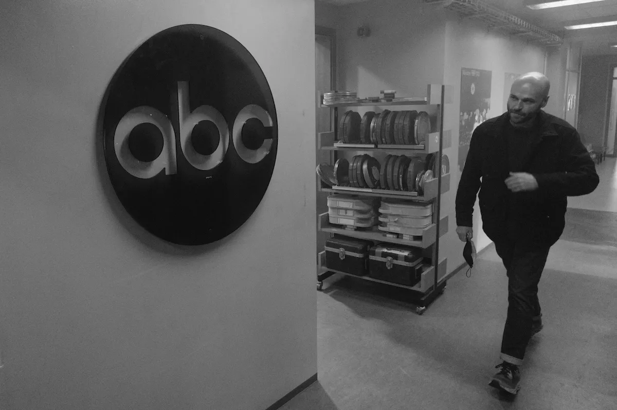 Main photo: John Ira Palmer on the set of September 5, photo by Kenneth Macdonald