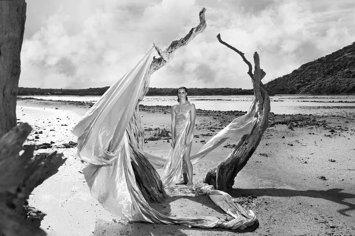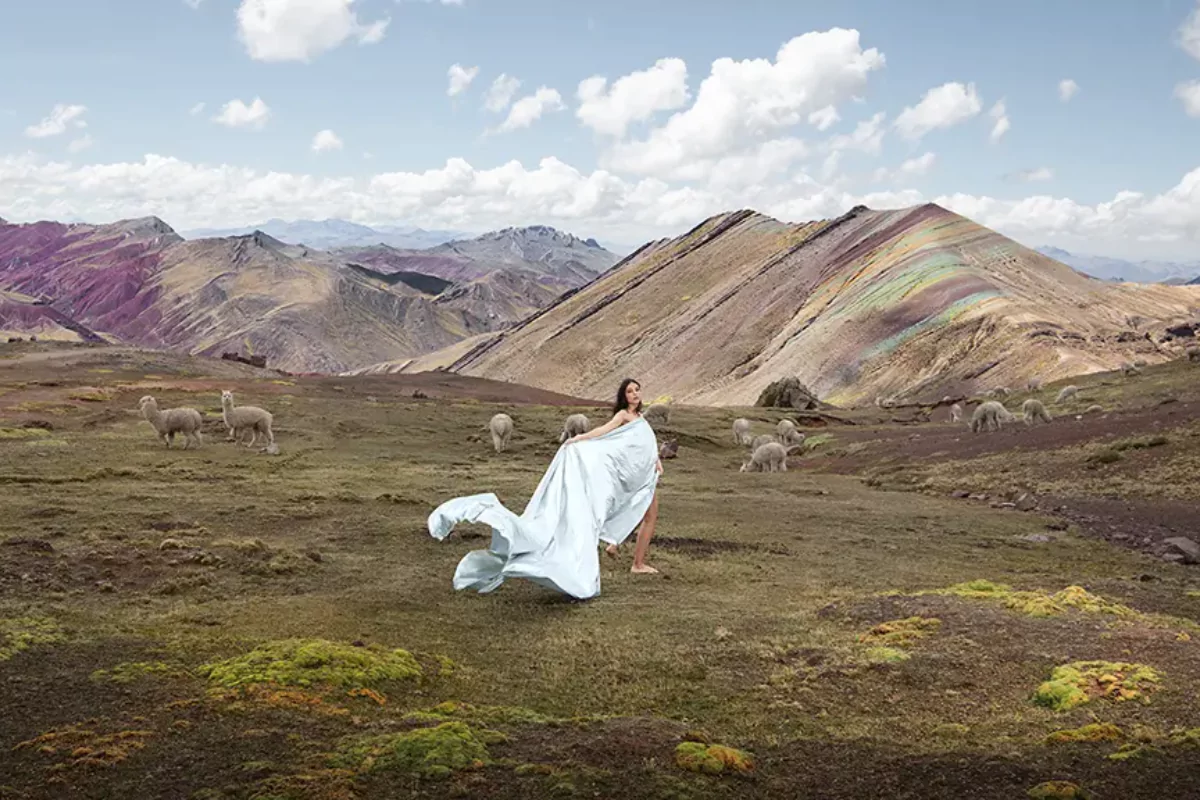 The exhibition, titled ‘Between Realms & The Spirit of the Wind’, features images taken in locations including Saint Barthélemy in the Caribbean, Iceland and Peru. In each photograph, the long silver veil billows and moves with the wind, creating striking visual effects against natural landscapes.