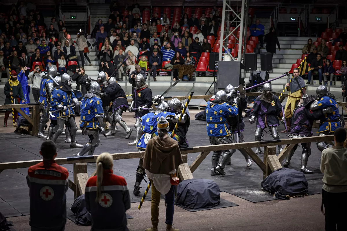 The big top was filled with spectators who watched 10 teams from France, Italy and Spain battle it out in seven-versus-seven full contact medieval combat, their cheers rising as warriors clashed with blunted weapons in historically accurate armour.