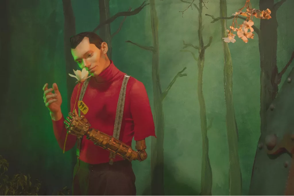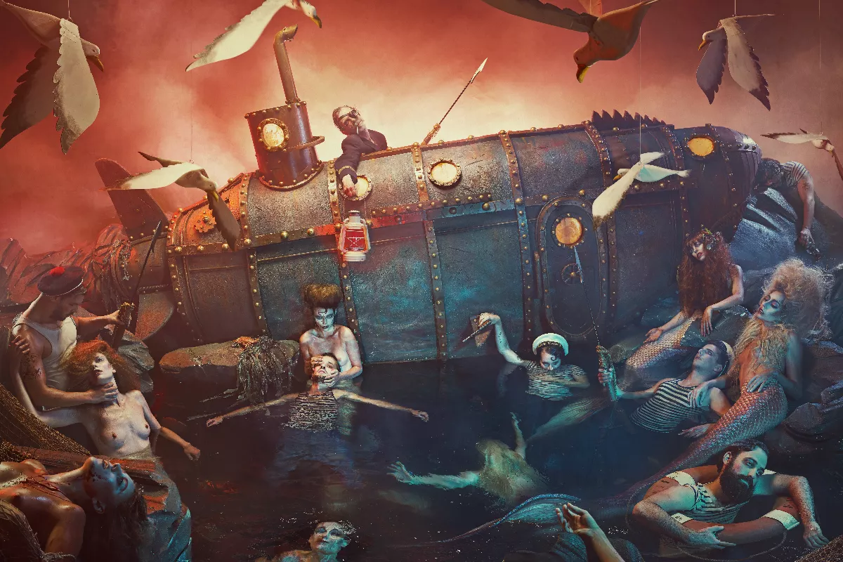 One of the key works in the show is ‘Le Tombeau des Sirènes – The Tomb of the Sirens’, part of a series called ‘La Chute des Empires – The Fall of Empires’. Each image in the series is set in the period between 1870 and 1914, a world in the midst of change and beginning to fracture. This piece depicts a stranded submarine entangled in a reinterpretation of ancient sailor and siren mythology.