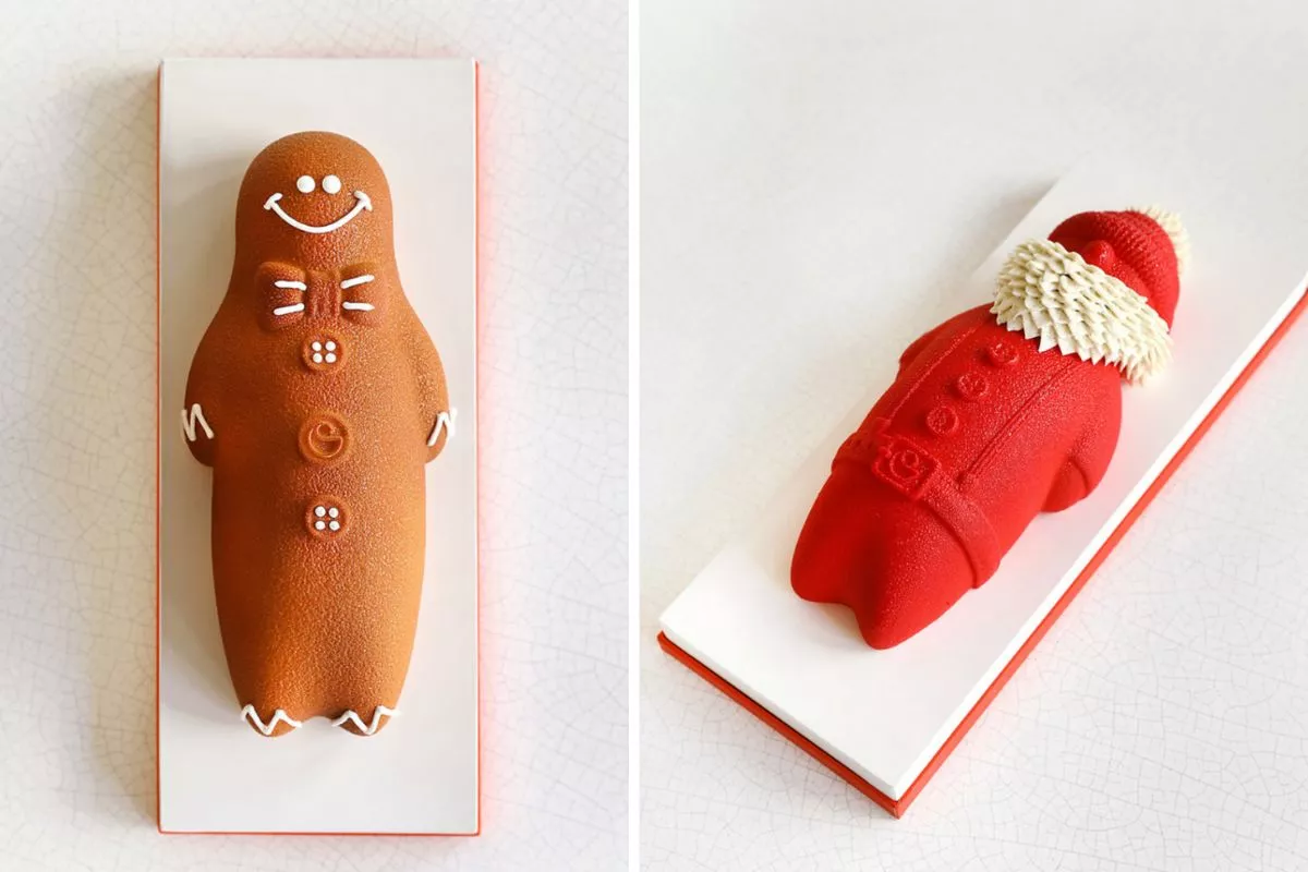 At the Hôtel de Paris Monte-Carlo courtyard, celebrated pastry chef Cédric Grolet presents his Christmas yule logs available until 31st December. The Père Noël features vanilla mousse, vanilla crémeux, vanilla milk jam, soft vanilla biscuit and salted caramel praline crisp, designed as a whimsical Santa Claus figure.