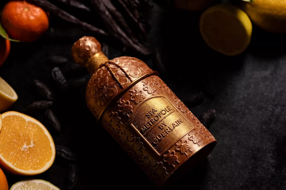 Pastry Chef Patrick Mesiano at the Hôtel Métropole Monte-Carlo has created a yule log sculpted to resemble Guerlain’s iconic Bee Bottle, originally designed in 1853 for Napoleon III’s future wife Eugénie. The dessert reproduces the bottle’s design in gold tones, evoking both the Place Vendôme column and the imperial bee symbol.